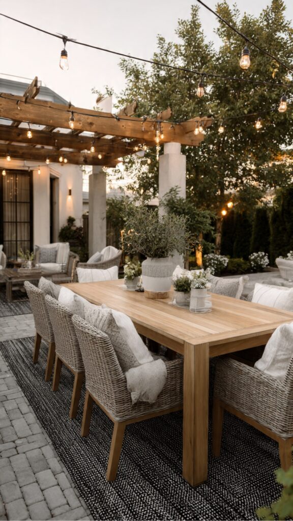 Outdoor dining areas benefit enormously from overhead definition. A pergola, umbrella, or shade sail above the dining table marks the space as purposeful and provides practical sun protection during daytime meals.