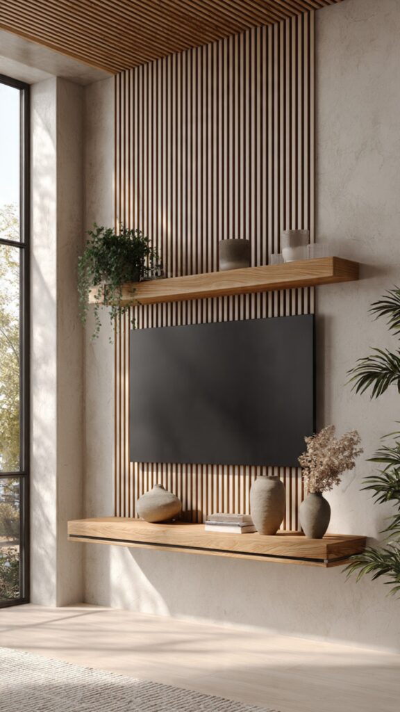 Objects placed on japandi TV wall shelving follow strict curation principles: fewer objects, better objects, more negative space. A single ceramic vase, a small sculptural object, three books arranged horizontally, a trailing plant in a simple vessel each piece is selected for its form quality, material integrity, and relationship to the other pieces on the shelf.