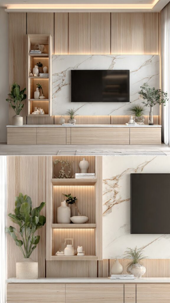 Marble and luxury stone TV wall design cladding represents the highest tier of feature wall design a material choice that communicates genuine quality, craftsmanship, and permanence in a way that no paint, panel, or wallpaper treatment can match. Whether using Calacatta marble, Nero Marquina, travertine, quartzite, or book-matched stone panels, a stone-clad TV wall design creates a room centerpiece of extraordinary beauty and lasting value.